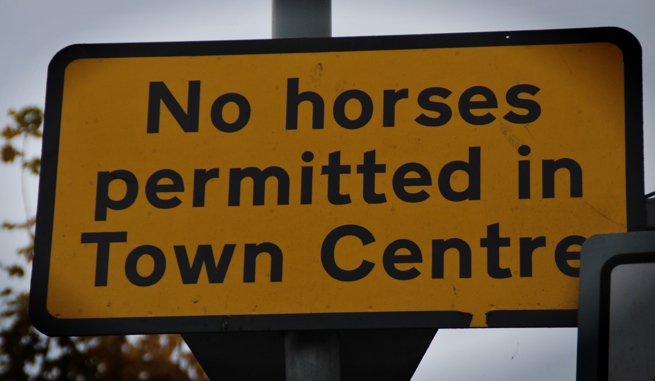 Horse Sign Published 9 December, 2012 at 655 × 381 in The End of Autumn in Cumbria: Or, How I Am Not A Country Boy I didn’t see any horses in the town centre, but evidently this has been enough of a problem in the past that the local authority felt the need for a sign.