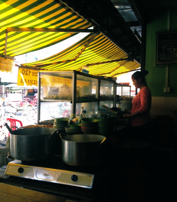 As we sat and ate our lunch people would drive up on mopeds to buy soups from the giant bubbling pots at the front of the restaurant. The owner would ladle them into little plastic bags, like you might take home a goldfish from the fair in, and then they’d zoom off. Meanwhile, nearby shop holders would wander up and give the big pots a contemplative stir. If they liked what they saw, they’d get it to go as well. If not, they’d wander on. Through all of this, the staff of the restaurant stared entranced at the tv, occasionally with hands over their mouths, all caught up in the drama of a Cambodian soap. The food may change the world over, but the people don’t.