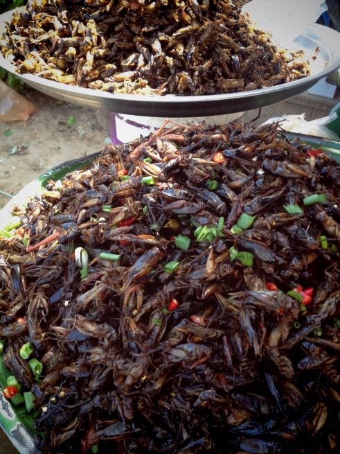 There were large dishes of fried insects in quite a few places in Cambodia, especially in rest stops at the side of the road. I never saw anyone eating them. I wasn’t about to be the first.
