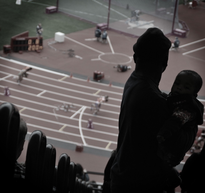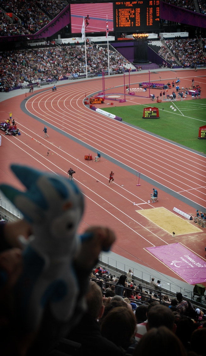 This is my photo and I was there. We’d been to the Olympic Park, of course, but hadn’t got tickets for the Stadium and utterly failed to get any tickets for the Paralympics. So receiving a phonecall from friends offering us two unwanted tickets to see athletics in the Stadium on a Saturday morning is in the same category as seeing people you know on the tube: impossible until it happens to you.