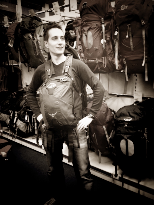 IT’S 24 HOURS later and I am standing in the Go store. I have not done any Research, besides some hurried googling on my phone on the way here. This does not qualify as capital R research. It is BK-C’s idea that we have come here, she having been here two weeks previous and identified a contender for her RTW backpack. Now we sit in the middle of the rucksack aisle, surrounded by an orgy of luggage. It’s like we’re auditioning for QVC, as we zip up and unzip the various bits of luggage around us, demonstrating to each other advantages and disadvantages of each bag. This one has a better, more comfortable back. That one has a daysack attached. This one has side opening; that one has top opening but more pockets.
